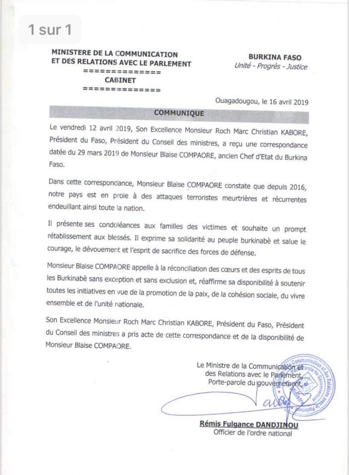 @Informateur.info- «Son Excellence Monsieur Roch Marc Christian Kaboré, président du Faso, président du Conseil des ministres a pris acte de cette correspondance et de la disponibilité de Monsieur Blaise Compaoré». Tel est l’essentiel du communiqué émis, ce mardi 16 avril 2019, par le ministre de la communication et des relations avec le parlement, par ailleurs, porte-parole du gouvernement burkinabè.