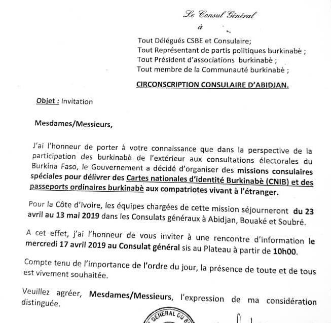 En prélude à ces missions qui vont durer trois semaines et qui participent des préparatifs du vote de la diaspora pour la présidentielle de 2020, en termes de documents requis, conformément au nouveau code électoral, le Consul Général d’Abidjan, M. Benjamin Nana invite la diaspora de sa juridiction à une rencontre d’information le mercredi 17 avril prochain au Consulat d’Abidjan-Plateau.