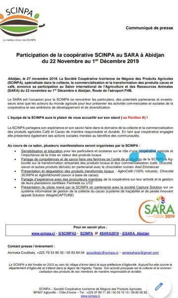 Abidjan, le 27 novembre 2019. La Société Coopérative Ivoirienne de Négoce des Produits Agricoles (SCINPA), spécialisée dans la collecte, la commercialisation et la transformation des produits cacao et café, annonce sa participation au Salon international de l’Agriculture et des Ressources Animales (SARA) du 22 novembre au 1er Décembre à Abidjan, Route de l’aéroport FHB.