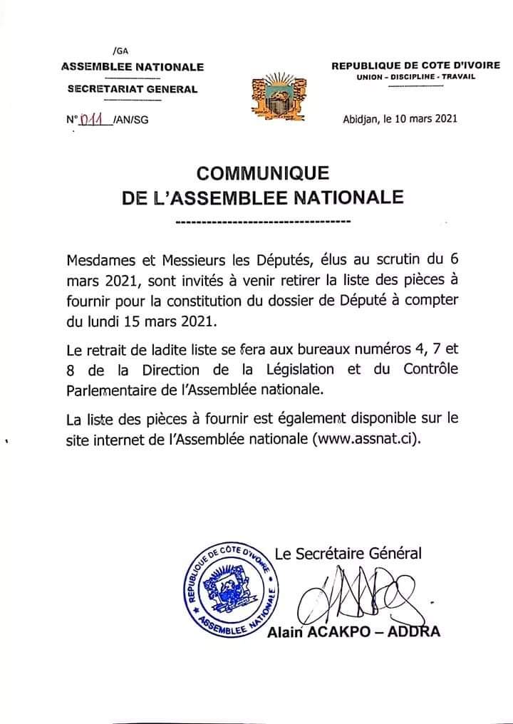 De fait, selon le communiqué parvenu à Informateur.info, « Mesdames et messieurs les Députés élus au scrutin du 6 mars 2021 sont invités à venir retirer la liste des pièces à fournir pour la constitution du dossier de Député à compter du lundi 15 mars 2021 », informe le texte signé du Secrétaire général de l’institution, Alain Acakpo- Addra.