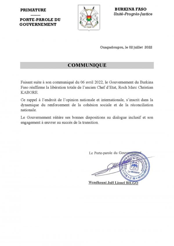‘@Informateur- Dans un communiqué rendu public, ce dimanche 3 juillet, le gouvernement de la transition burkinabè, réaffirme la liberté totale de l’ancien Chef d’État, Roch Marc Christian Kaboré. Précisant que ce rappel participe du renforcement de la cohésion nationale. Ci-dessous le communiqué signé du porte-parole, Lionel Bilgo.