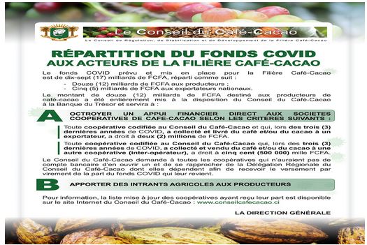 ‘@Informateur- 5 mois après le début de la distribution décriée du fonds Covid-19 des producteurs, le Conseil du Café-Cacao a enfin rendu public sa clé de répartition. Critiquée sur la gestion de ce fonds dont les acteurs ignoraient tout des conditions, la direction générale du Conseil Café-Cacao a fait publier mercredi sur son site web ce qu’il considère comme étant le fondement de la distribution. Une publication qui intervient curieusement en pleine grève de la Centrale syndicale.