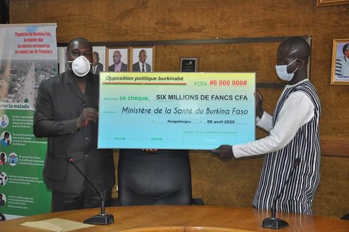 ‘@Informateur.info- L’opposition politique burkinabè n’est pas en marge de la lutte contre le coronavirus au Burkina Faso. En effet, ce jeudi 9 avril 2020, elle a procédé à la remise d’un chèque d’un montant de six millions FCFA au ministère de la santé.