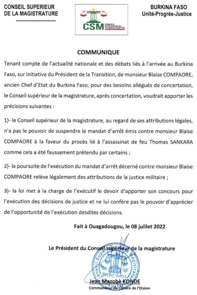 Dans un communiqué en date du 8 juillet 2022 dont Informateur.ci s’est procuré copie, « le CSM au regard de ses attributions légales, n’a pas le pouvoir de suspendre le mandat d’arrêt émis contre M.Blaise Compaoré à la faveur du procès lié à l’assassinat de feu Thomas Sankara comme cela a été faussement prétendu par certains », dénonce son président, Jean Mazobè Kondé.