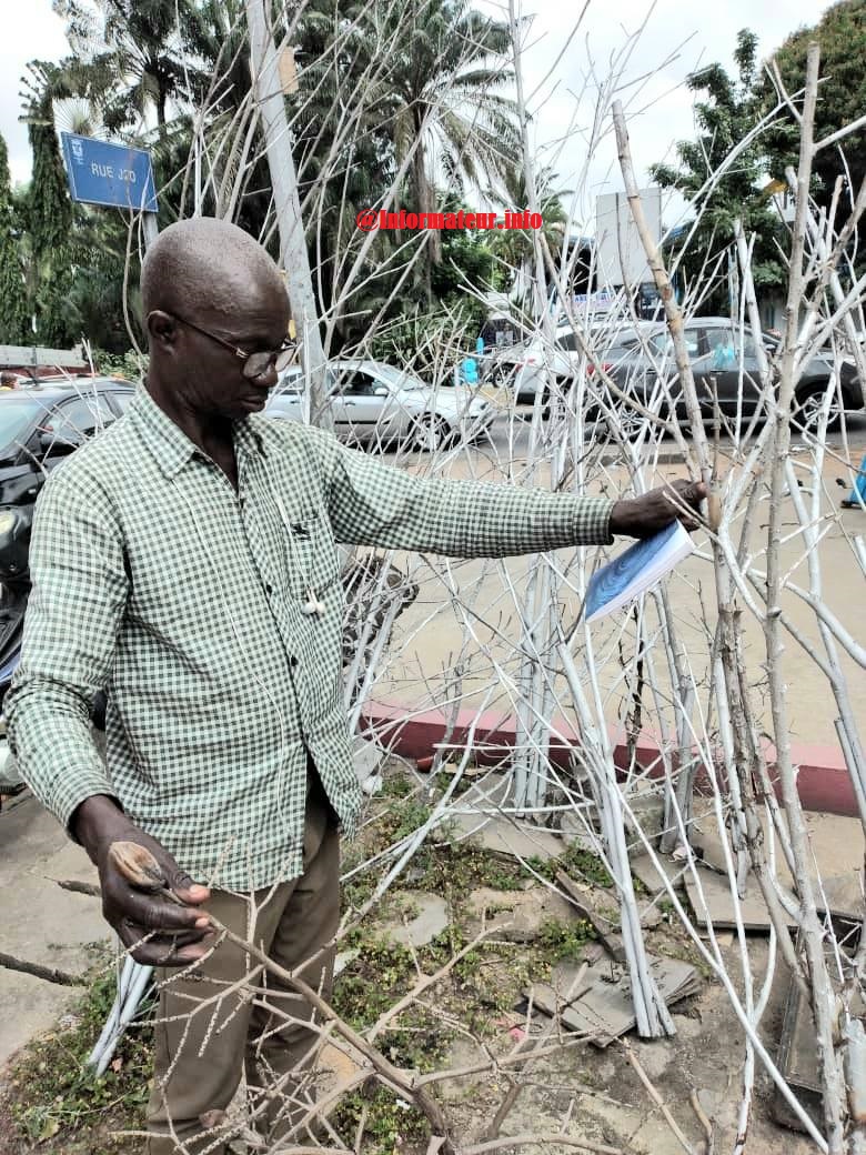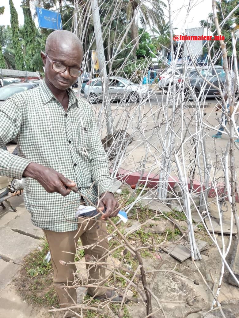 Istallé dans les environs de la Paroisse Saint-Jacques à Cocody 2 Plateaux, au bord du Boulevard Latrille, Zapsonré André travaille les branches mortes pour les transformer en œuvres d’art.