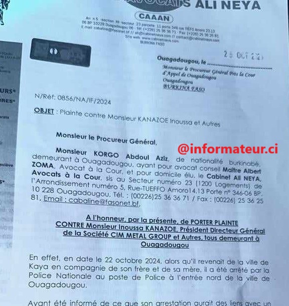 Selon des sources proches de l’affaire, Aziz Korgho, par le truchement de son avocat, a saisi le Procureur en portant plainte conformément au code de procédure pénale, contre Inoussa Kanazoé pour enlèvement, et séquestration. Beaucoup se posent des questions sur ce dossier qui commence à faire grand bruit à Ouagadougou. La rédaction d’Informateur.ci mène ses investigations pour éclairer le public sur cette affaire à senteur de souffre. Dans notre prochaine publication sur ce dossier, nous reviendrons sur ce que l’homme d’affaires reproche réellement à Aziz Korgho et que dit ce dernier pour sa défense. Affaire à suivre le 1er décembre 2024 dans l’Acte 2.