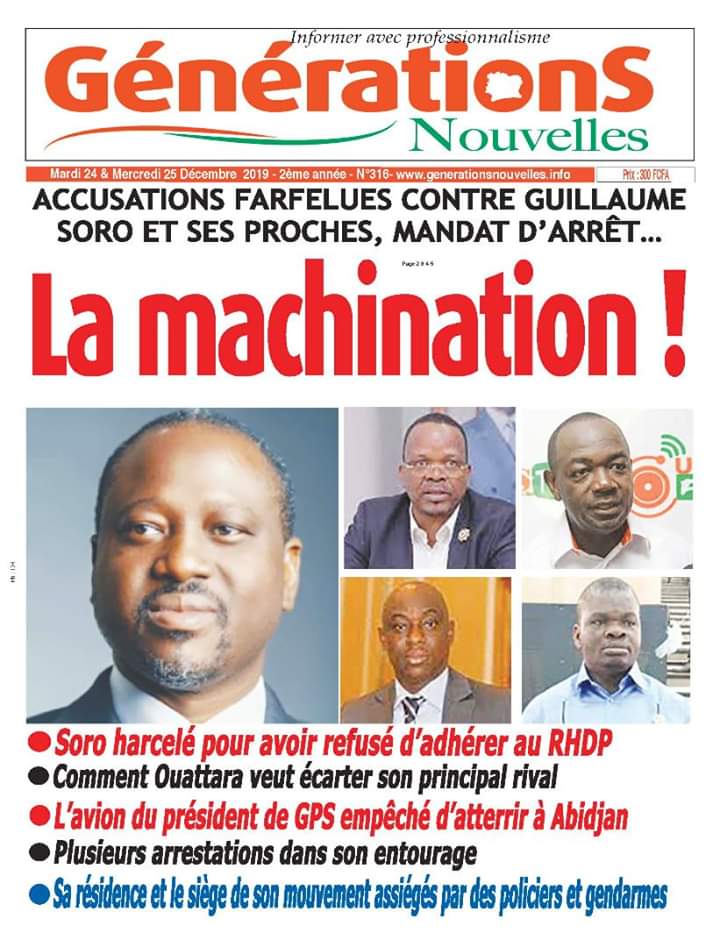 Selon Générations Nouvelles, proche du président de GPS, les accusations ‘’farfelues’’ contre Guillaume Soro et ses proches, le mandat d’arrêt ne sont que de la ‘’machination’’, expliquant que ‘’Soro est harcelé pour refuser d’adhérer au RHDP’’. Le confrère savoir ‘’comment Ouattara veut écarter son principal rival’’ dont ‘’l’avion a été empêché d’atterrir à Abidjan’’.