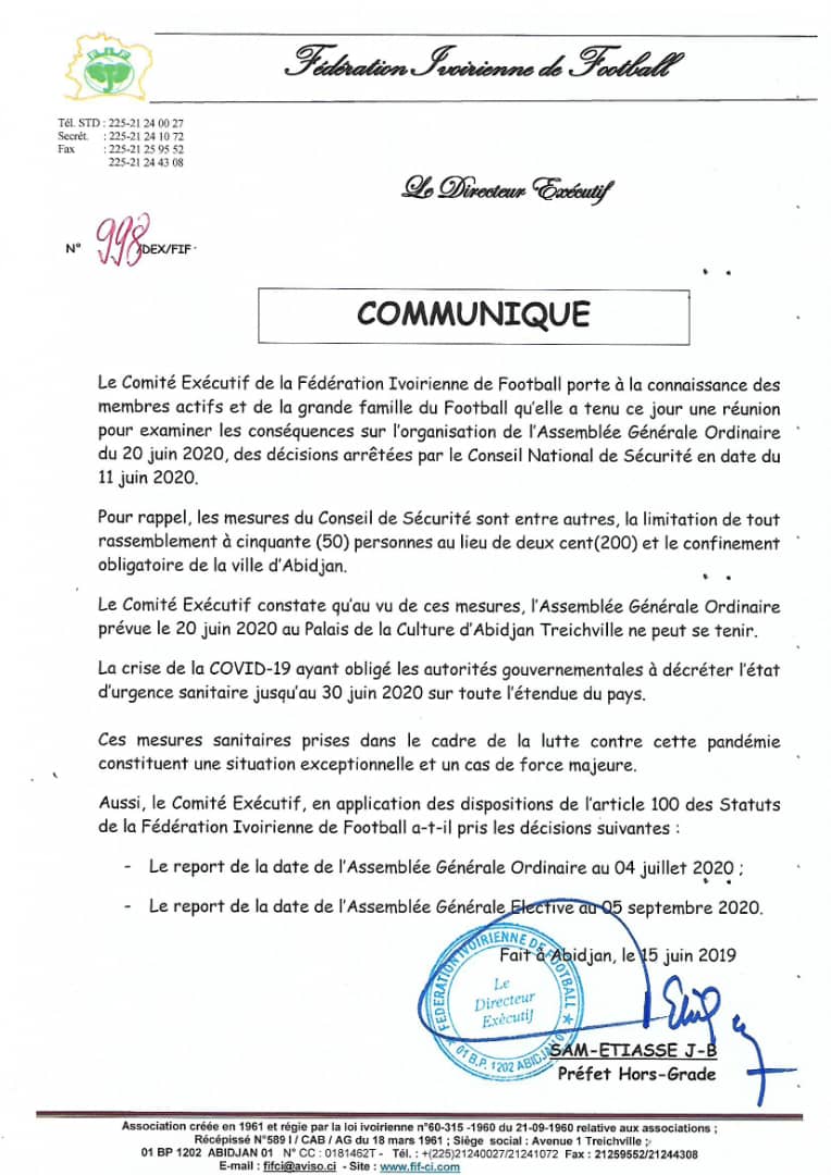 ‘@Informateur.info- L’Assemblée générale ordinaire (AGO) et l’Assemblée générale élective de la Fédération ivoirienne de football (FIF) sont, respectivement, reportées au 4 juillet et 5 septembre 2020, rapporte le communiqué ci-après de l’instance du football ivoirien pour cause de la maladie à coronavirus (Covid-19).