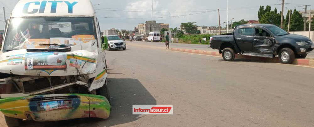 Nous ignorons les circonstances exactes de l’accident. Mais l’état des deux véhicules laisse penser que le pickup a été percuté du côté de sa portière droite par le gbaka. La police s’est aussitôt déployée pour réguler la circulation et procéder au constat d’usage. C’est le lieu de rappeler aux usagers de la route la prudence.