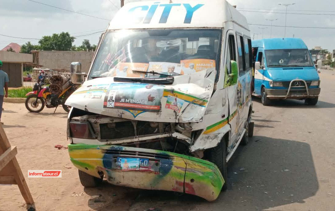 @informateur.ci- Un mini-car de transport en commun communément appelé gbaka, loué par l’équipe de campagne du candidat aux Législatives, Beugré Mambé, a été impliqué, ce mardi 23 décembre 2025, dans un accident de la circulation avec un véhicule de type 4×4.